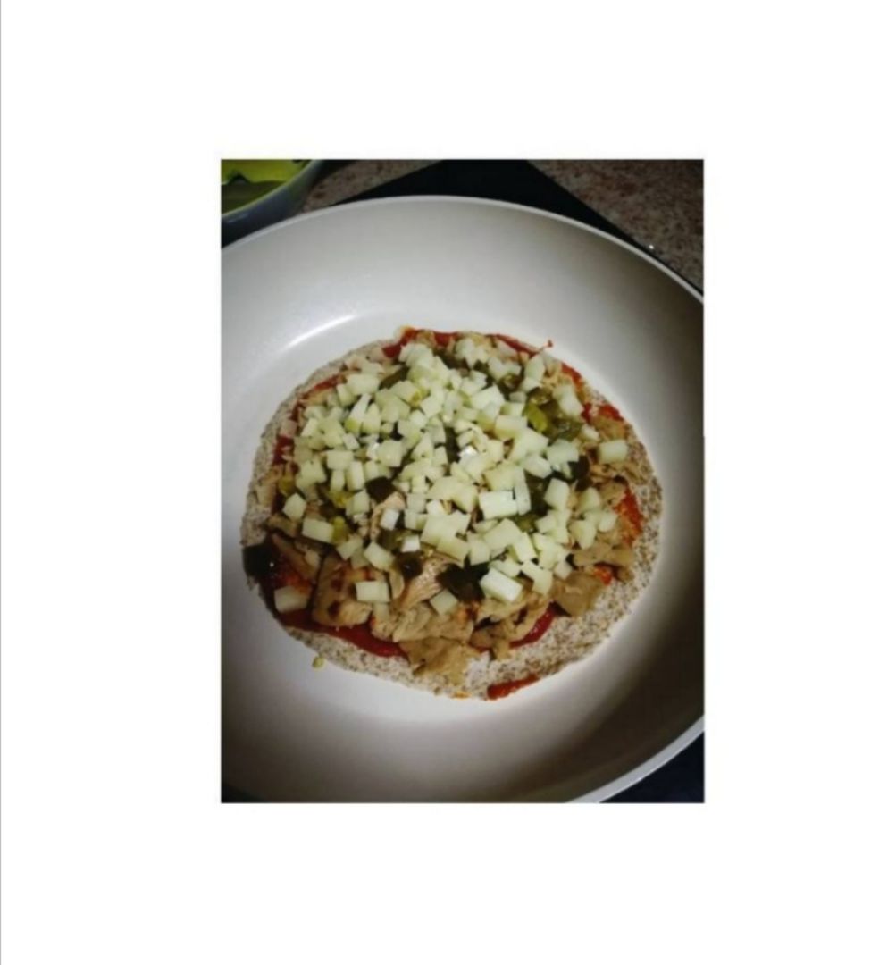 Place a wheat tortilla in a non-stick frying pan and add some Mexican sauce, the chicken, the chopped jalapeños and the cheese cut into small pieces.