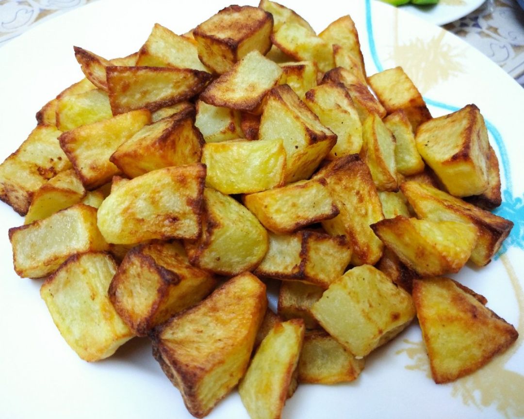 Mientras precalienta la máquina 5 minutos a 200°, cortar las patatas en daditos. Luego ponerle sal y AOVE y remover bien para que se impregnen todas. ⚠️Nota: pueden cortarse como se quiera: bastones, rodajas, gajos, daditos... En mi caso, los mejores resultados los he conseguido siempre cortándolas así, en dados como se ve en la foto.