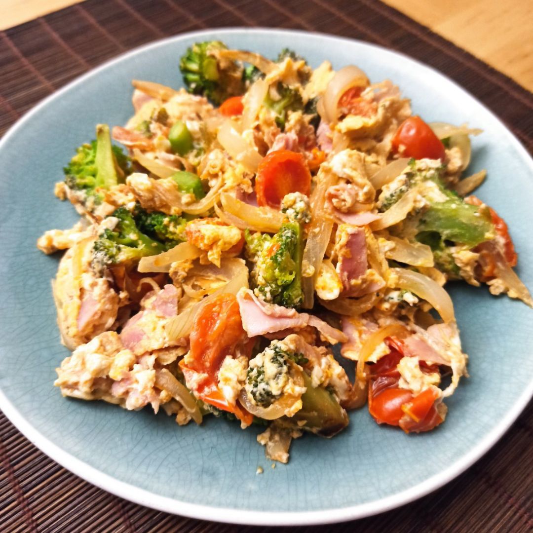 Cuando las verduras ya están, añadir el jamón cocido, el huevo y las claras. Hacer durante 3' a fuego bajo-medio