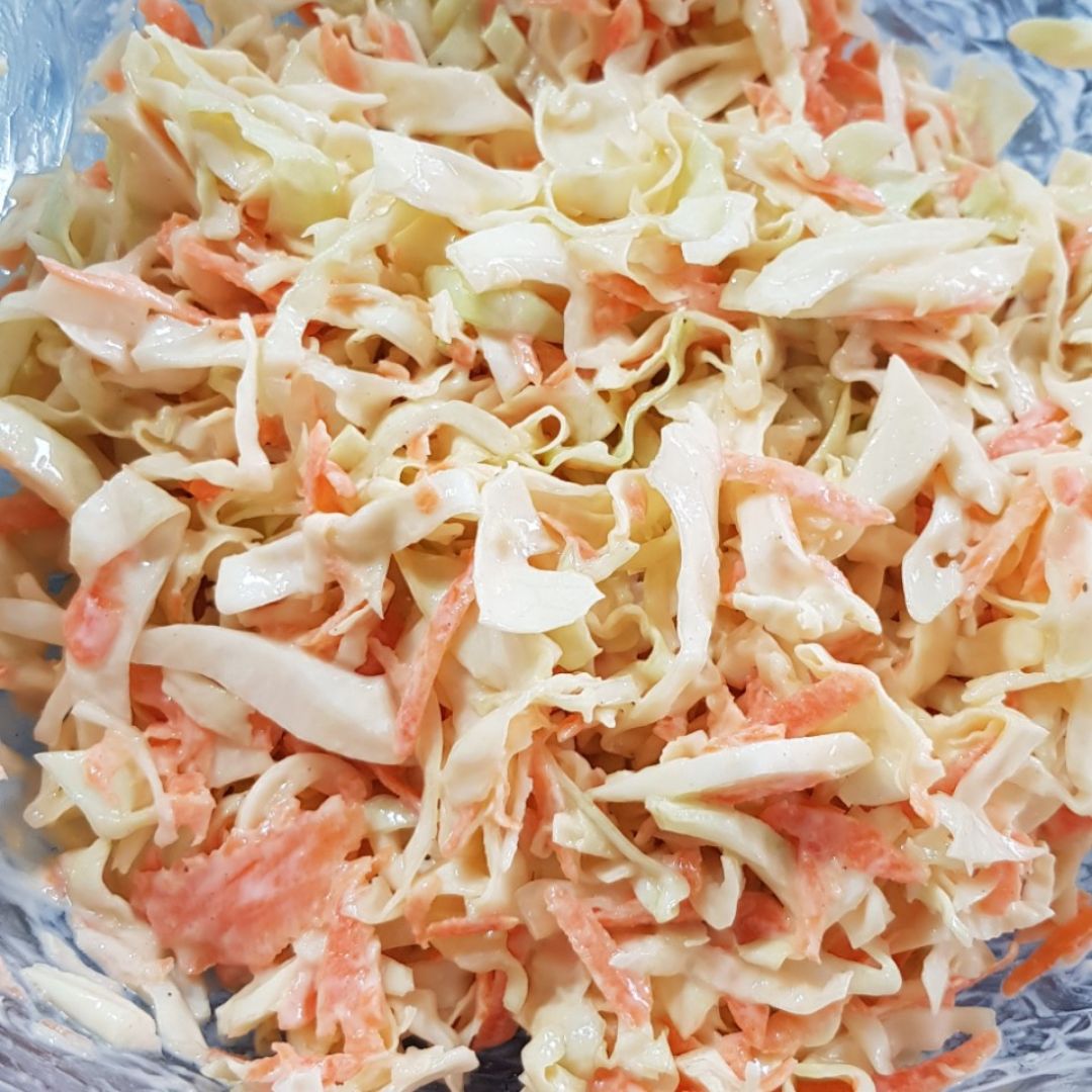 Echamos el aderezo sobre el repollo y la zanahoria. Lo mezclamos y.... a disfrutar!!