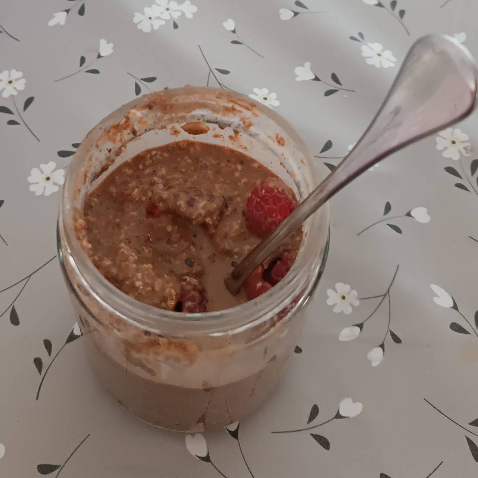 Echar todos los ingredientes (avena, chía, yogur griego, cacao en polvo) y después la leche (según te guste de espeso echa más o menos para que no esté tan espeso)