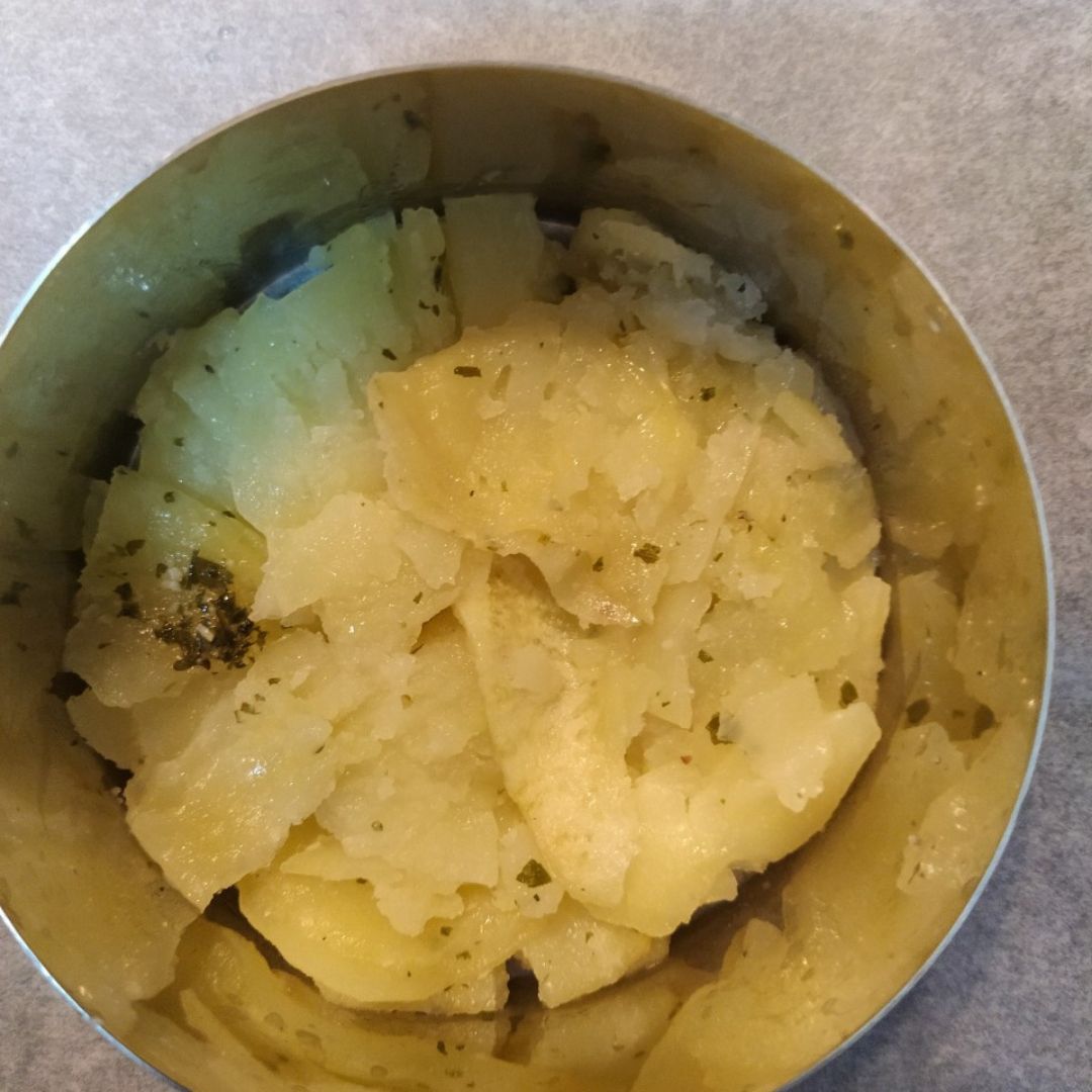 Perlas las patatas, Cortar en rodajas añadir en un bol con sal, aceite, 2 cucharadas de agua, perejil y pimienta.