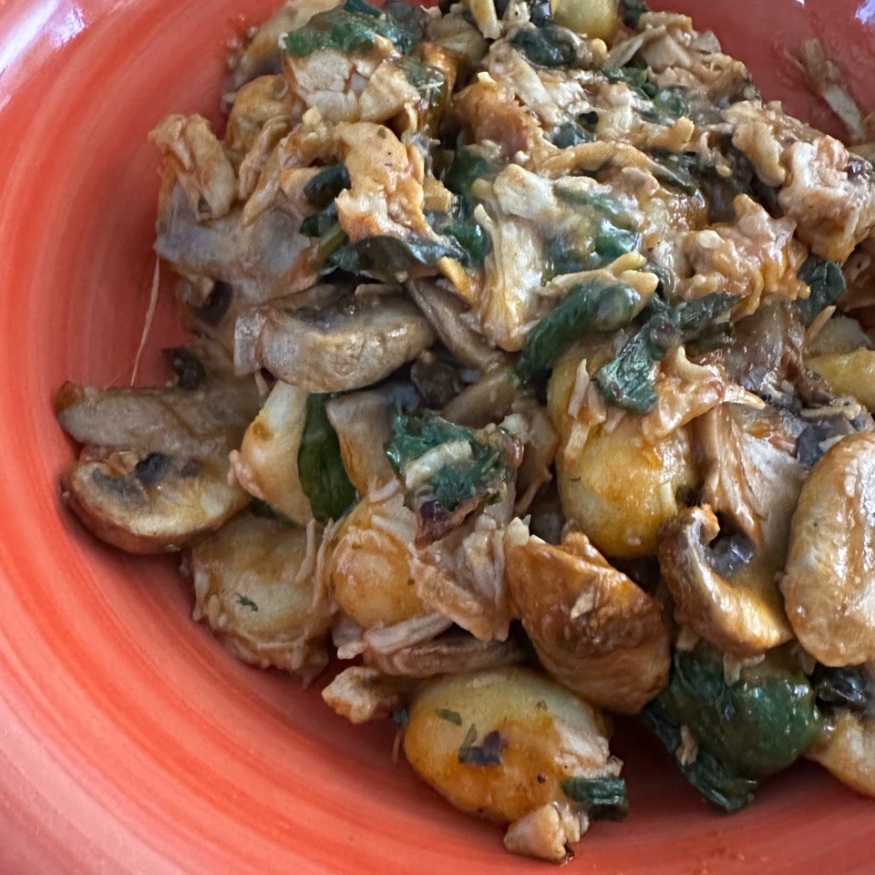 Trocea el champiñón y colócalo en una fuente de horno junto con las espinacas, el pollo desmigado, los gnocchi, el aove y las especias.
