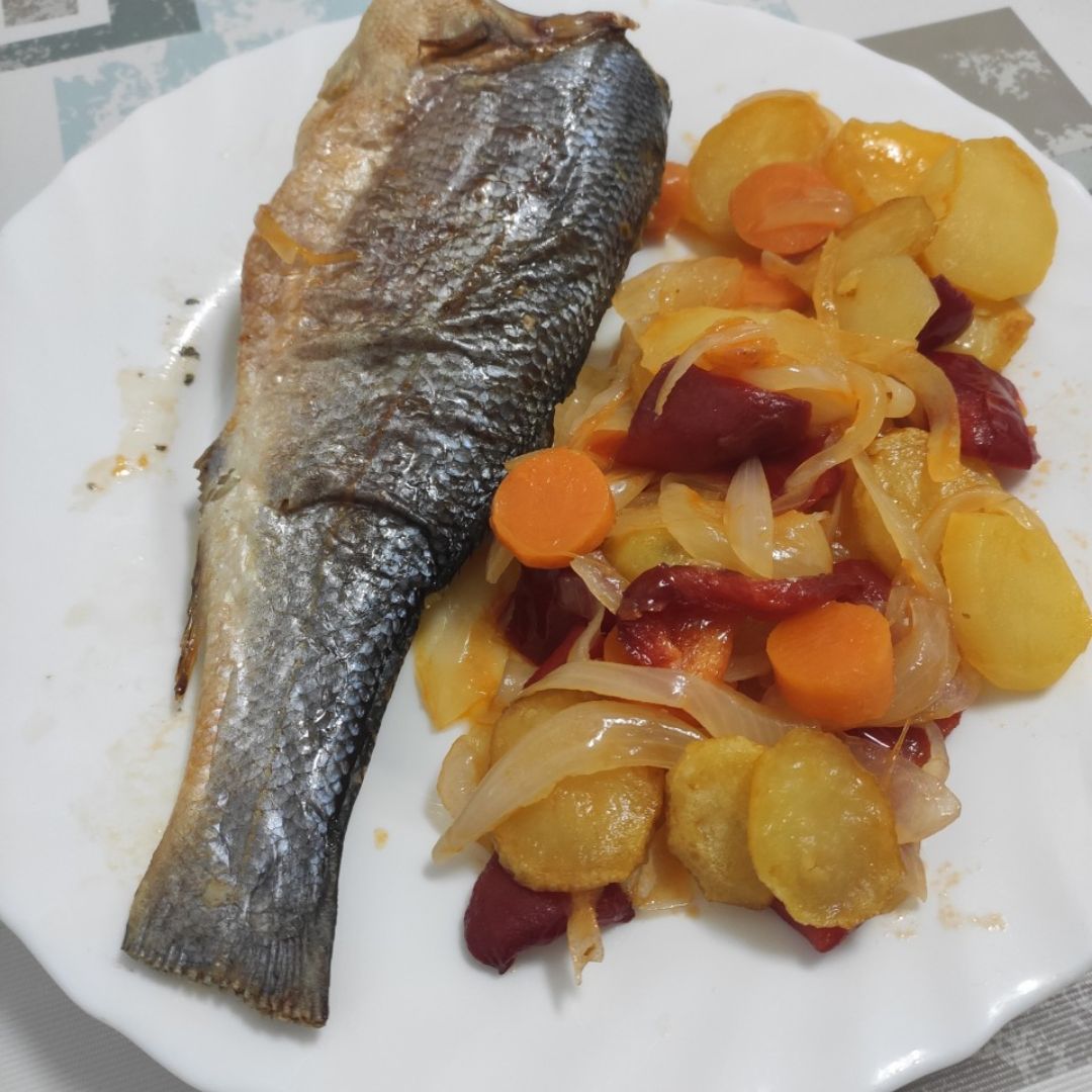 Hacer una cama en la bandeja del horno con los ingredientes anteriores y colocar encima la lubina