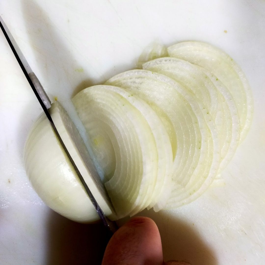 Corta en juliana una cebolla grande.