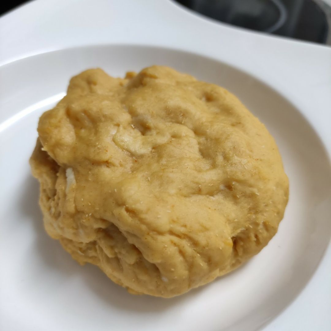 A continuación echamos el agua, el vino blanco (cerveza también queda bien rica) y aceite (yo suelo usar menos AOVE y más vino) y lo mezclamos hasta que nos salga una bolita (mambo velocidad cuchara 3 durante 3'). Si vemos que se queda muy seca, se incorpora más AOVE pero de muy poco en poco.