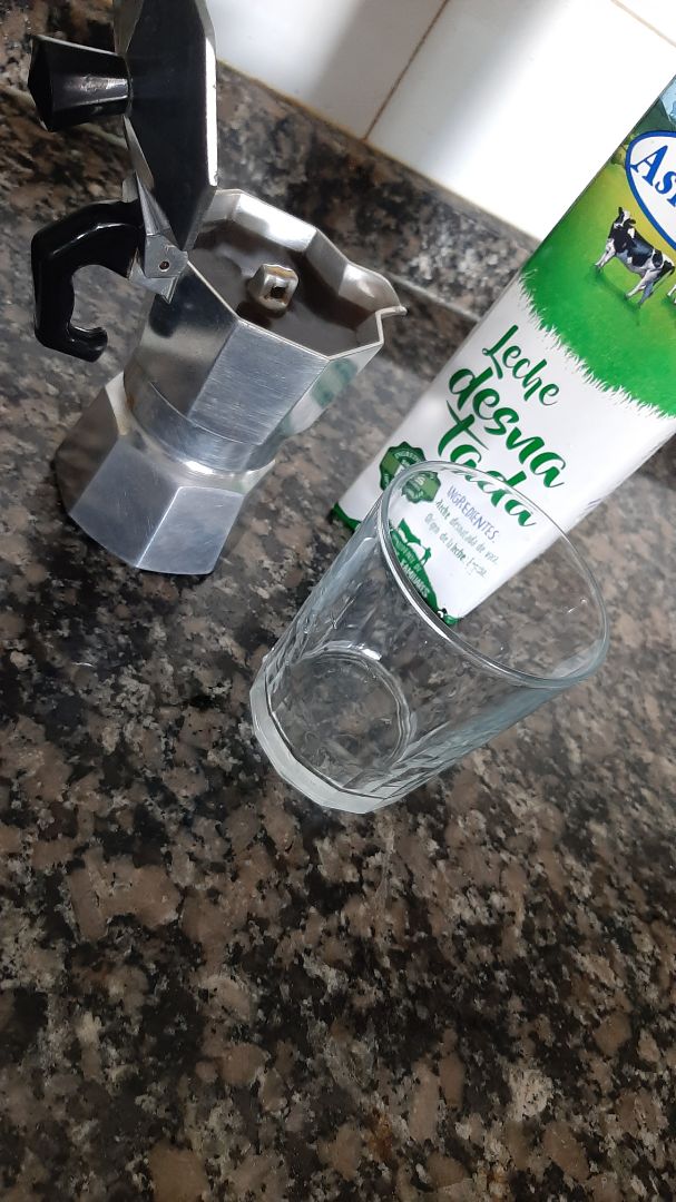 Preparar el café y calentar 1 vaso de leche en microondas 2 minutos a temperatura alta