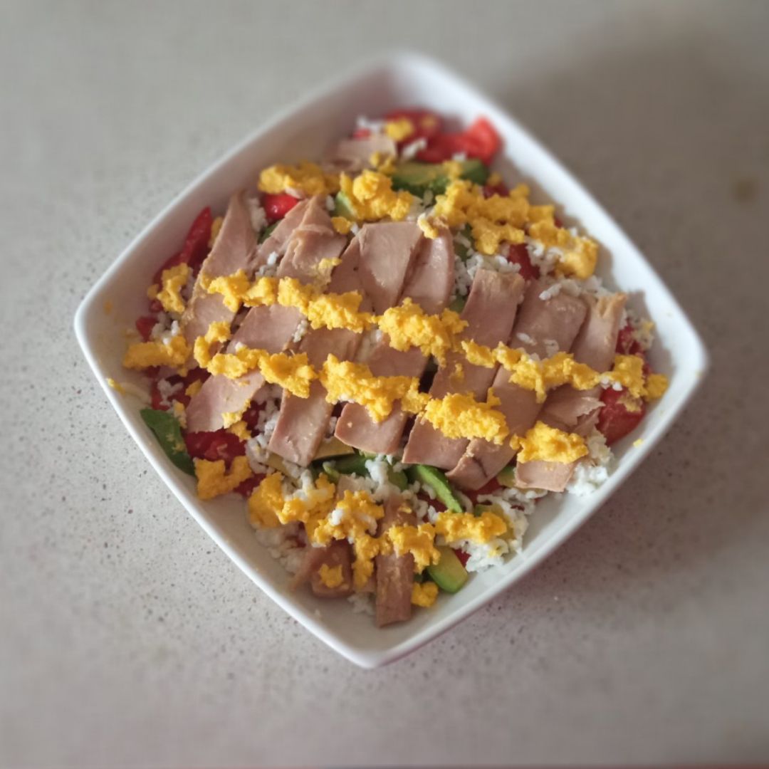 Ensalada de pimientos, ventresca, aguacate y huevo cocido.