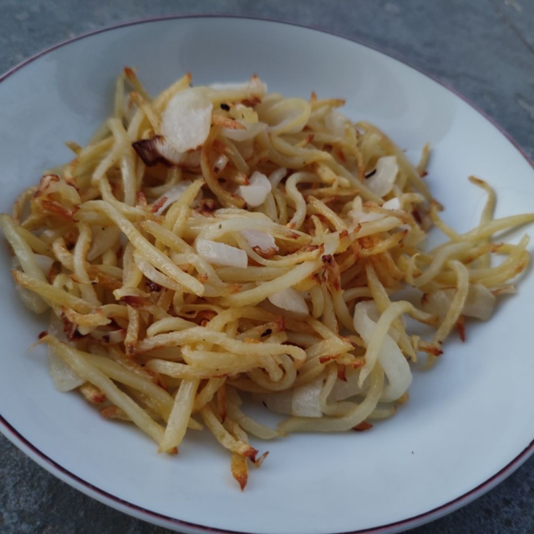 Couper les pommes de terre et l'oignon en julienne dans une casserole avec de l'eau froide, puis les égoutter et les sécher. Verser l'huile dans la casserole lavée et séchée et mélanger à l'aide d'une spatule. Nous avons mis le tout dans le Airfryer pendant 20 minutes en remuant toutes les 4 minutes à 170 degrés.