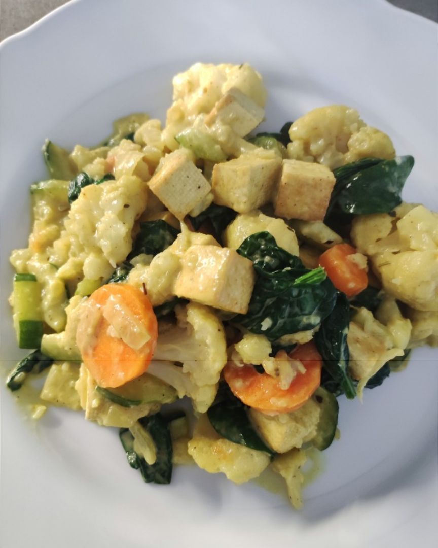 Por último, añadimos las espinacas frescas y la leche de coco (la parte sólida de la lata más un poco de la líquida). Vamos removiendo todo bien y apagamos el fuego y servirnos cuando la salsa esté espesura y todo bien integrado.