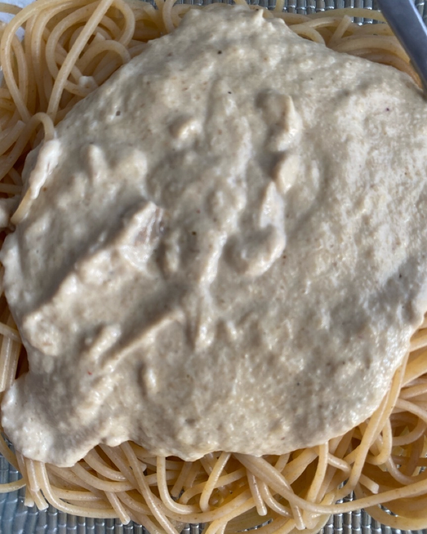 Mientras que ponemos a cocer os espaguetis doramos en una sartén la cebolla. Cuando este doradita añadimos los champiñones. Pasados una minutos incorporamos la nata para cocinar junto con las especias y dos lonchas de queso. Cuando la salsa esté espesa, la pasamos por la batidora.