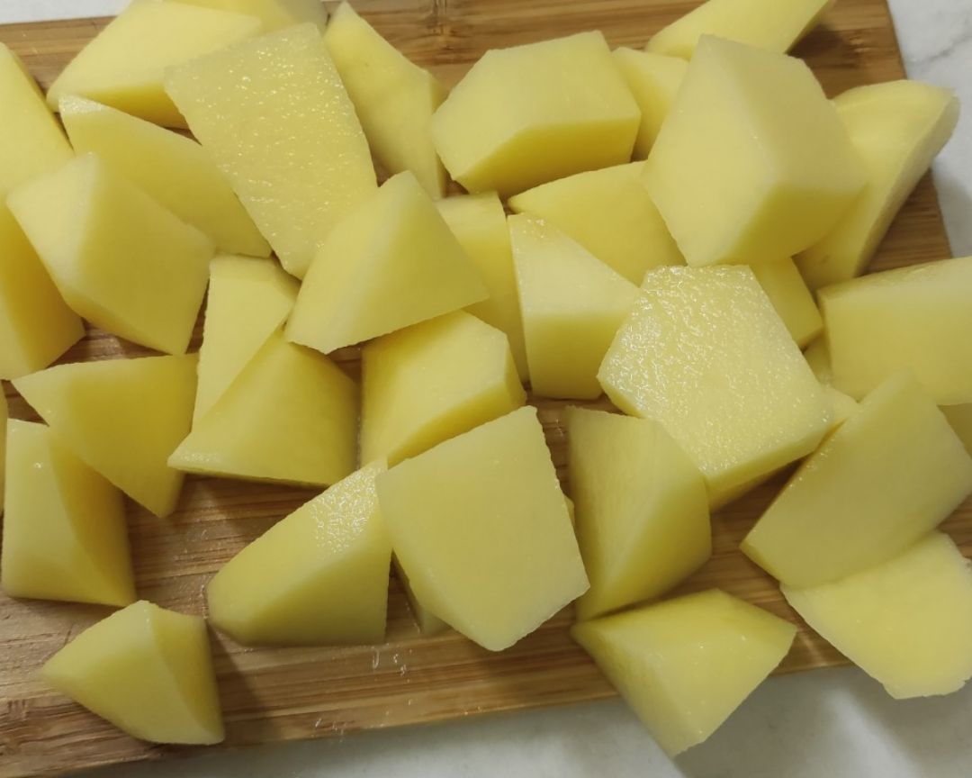 Mientras tenemos los muslos al fuego, pelamos las patatas y las cortamos en taquitos o en rodajas, según preferencia de cada uno.