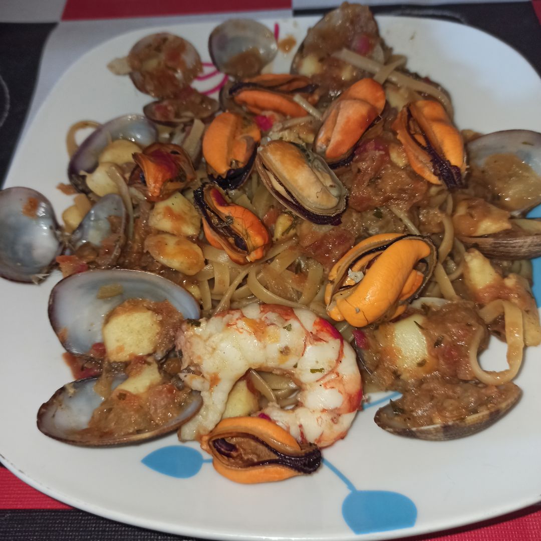 ✒ Apagar el fuego 🔥 y decorar con los mejillones que teníamos cocidos. Listo para servir. Buen provecho 😉.