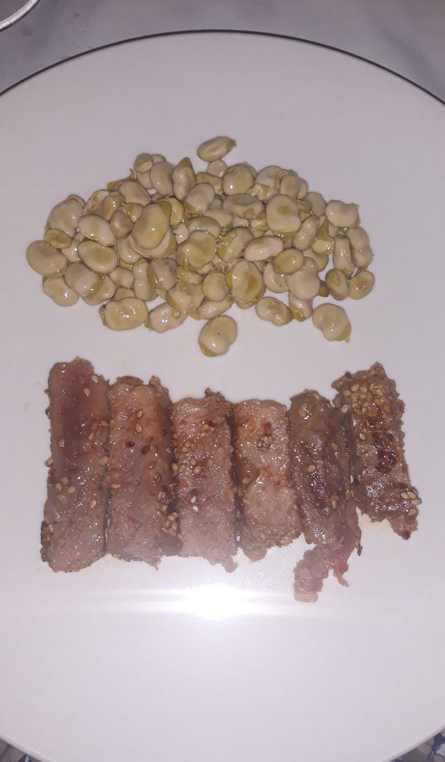 Después lo cortamos en rodajas de 1-2 cm y lo presentamos en una bandeja. Para acompañar escurrí bien unas habitas baby y las calenté en una sartén. A comer!