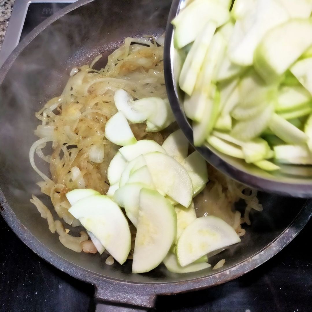 Cuando esté dorada la cebolla, incorpora el calabacín y 2 cucharadas más de AOVE.