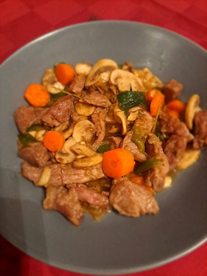 Mientras, en una sartén aparte hacemos un filete de ternera a la plancha cortado en tiras.