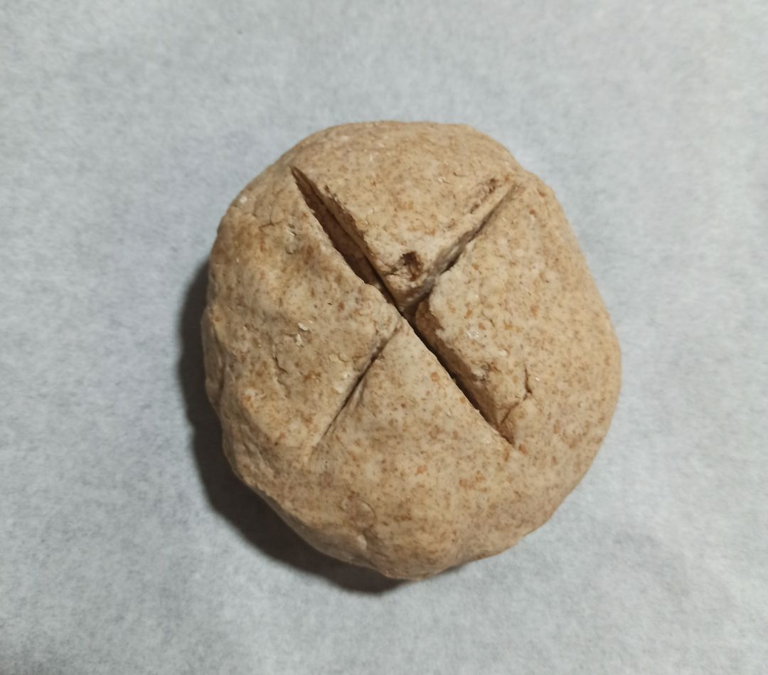 ✒ Hacer una bola con la masa y rajar con un cuchillo 🔪 la parte de arriba haciendo una cruz. Dejar reposar tapado con un trapo durante 30 minutos. Volver a amasar para sacar el aire. Y lo dejamos d reposar de nuevo 1 hora. Después volví a amasarlo y lo deje de nuevo 15 minutos reposando.