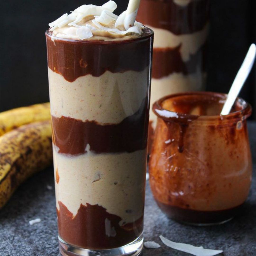 En el vaso donde vayamos a presentarlo vamos sirviendo el batido intercalando la parte con algarroba y la que no tiene, creando "capas"