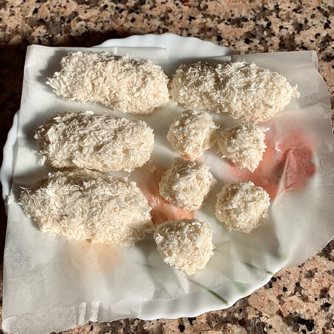 in una ciotola aggiungere il cocco grattugiato 🥥 e il latte vegetale 🥛 di vostra scelta, fino a quando non si riesce a modellarlo. Con le mani, formare barrette, palline, ... e disporle su una placca con carta da forno. Una volta terminati, metterli in freezer per 1 ora. 🧊